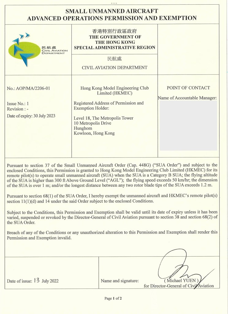 Despite the very different nature of R/C model flying compared to drones operations, it is still regulated under the new SUA order Cap448G in Hong Kong. Before the implementation of the SUA order in June 2022, our team represented HKMEC negotiating with HKCAD in obtaining its first AOP for the R/C flying activities at IMAC. Due to the specific nature of R/C flying (higher flying speed, larger airframe size and the lack of suitable flight-log and geo-awareness system for R/C model etc.) a very lengthy discussion was carried out and the AOP was finally granted to HKMEC under several exemptions.